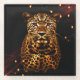 Eclipse Majesty, exhibe un leopardo con piel dorada brillante y puntos distintivos, ambientados en un fondo oscuro. Los ojos del leopardo están iluminados con un color violeta brillante, lo que crea un efecto místico y sorprendente. El entorno oscuro se ve acentuado por unas luces dispersas y cálidas que le confieren al lugar una atmósfera dramática casi de otro mundo.