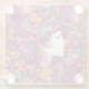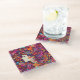 Posavasos de vidrio estilo boho hippie retro multicolor con inspiración de los 70. La característica principal es un retrato femenino que mira hacia la izquierda, rodeado de garabatos divertidos. Los colores son principalmente púrpura con adición de los colores turquesa, rosa, naranja.