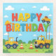 Feliz cumpleaños tema constructor de obras con pequeños vehículos de construcción y sombrero.