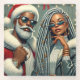 Santa y un acompañante están listos para celebrar, ambos con elegantes atuendos temáticos de Navidades. Se paran en un fondo de luces y decoraciones de vacaciones, listos para una reunión festiva.