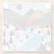 Un hermoso paisaje con texturas únicas que muestran un paisaje de río y montaña con un zorro en caza de salto medio en la nieve en tonos rojos, verdes, azules y beige.