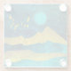 Resumen de diseño de paisajes montañosos en tonos audaces de oro, cian y azul con un amanecer, estrellas y pájaros.