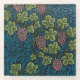 Illustration of grapevines with clusters of pink grapes and green leaves against an intricate blue leafy background. The design is vibrant and detailed.