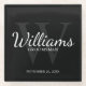Añada un toque personal a su boda con una pastilla de vidrio personalizada. Esta montaña rusa presenta el nombre personalizado del groomsman en un estilo de fuente clásico de escritura blanco con detalles bodas en estilo de fuente serif clásico blanco y monograma en estilo de fuente serif gris clásico como fondo, sobre fondo negro. También perfecto para el mejor hombre, padre de la novia, portador de anillo y más.