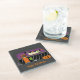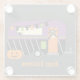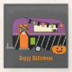 Gráfica divertida de Halloween presenta un trailer retro estilo rv con colores estacionales con calabaza, telaraña y banderas sobre la ventana, sobre fondo gris carbón vegetal con el naranja "Feliz Halloween" personalizable superpuesto.