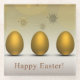 Un ilustracion abstracto y moderno de Pascua con 3 huevos dorados de Pascua sobre un fondo de boquilla con flores abstractas.