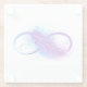 Símbolo infinito con una hermosa pluma pintada de color violeta y azul brillante sobre fondo blanco.