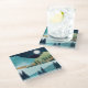 Un hermoso paisaje con texturas únicas que muestran un paisaje de lago montañoso con una luna en alza y un cielo estrellado en tonos azules, dorados, verdes y turquesas.