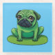 Pug verde lindo que se parece a una rana sentada en un lililipad. Se puede cambiar el color de fondo.