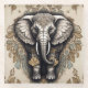 Majestuoso Elefante Mandala. ilustracion de un elefante en el centro, intrincado, con patrones que se asemejan a mandalas y motivos florales. La cabeza del elefante está adornada con un diseño elaborado, que se funde perfectamente con sus características naturales. Alrededor del elefante hay motivos florales delicados y simétricos, con hojas y flores en tonos beige, marrón y azul suave. Toda la imagen tiene una composición armoniosa y equilibrada, creando un sentido de elegancia y tranquilidad.