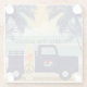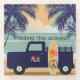 Monasterio con imagen de un camión de 70 años, tabla de surf y señal de paz. ¡Viajando por las olas!