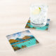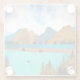 Un paisaje abstracto con texturas únicas que muestra una escena de montaña y lago con un bote de remos solitario y un impresionante amanecer y rayos de sol en tonos azules, verde azulados, cian y oro.
