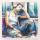 Ai arte representando a una mujer en el metro en un tanque, pantalones vaqueros despojados simplemente relajándose escuchando música en sus auriculares.