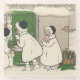 Ilustracion vintage del ilustrador infantil P. Ebner. Tres chicas, probablemente hermanas, golpean una gran puerta verde, esperando con regalos de vacaciones (¡incluso un pequeño árbol y un cerdo!) en la mano.