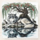 Una reunión tranquila de lobos enclavados bajo un árbol lleno de frutas, reflexionando sobre la superficie del agua con un marcado contraste de vitalidad y calma. El lobo predominante descansa con los ojos cerrados, encarnando la esencia de la paz, mientras su familia la rodea, lo que sugiere un momento de relajada unidad en medio de la abundancia de la naturaleza.