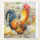 Un gallo de corral enmarcado por un costillar de gallinas y heno en un suave enfoque a su alrededor. Los suaves amarillos y grises ponen el colorido gallo en el centro de la atención, justo donde el orgulloso pájaro gusta estar. Este es un dibujo de un medio mixto en un lápiz de color pastel y aceite. Por Amanda Diehl, Diseños Paxdomino