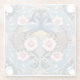 Baldosas de cerámica de época con dos pavos reales uno frente al otro con flores rosas, plumas azules, cola marrón, detalles amarillos, rodeados de hojas y adornos florales, sobre un fondo azul.