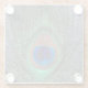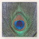 Un cierre de una pluma de pavo real sobre un fondo gris.