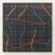 El retro de los años 1980, la pintura de color primario traza un patrón de salpicadura sobre un fondo geométrico de puntos en blanco y negro.