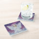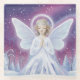 This whimsical glass coaster features a Snowy winter fairy/angel with glowing halo and translucent wings prays amid sparkling pine trees under a starry purple night sky, magical scene. Finished as a oil acrylic paint print.