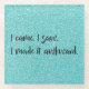 Proteja sus tabletas o superficies de mobiliario con un Purpurina Verde azulado que hice una escoria de vidrio incómoda. El diseño de la montaña rusa muestra el texto "Vine. Vi. Lo hice incómodo". En una letra manuscrita con un fondo verde azulado purpurina. Se ofrecen regalos adicionales con este diseño, así como una variedad de colores.