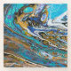 Azules y marrones y un toque violeta que parece agua turquesa y piedras naturales que se asemejan a un río que corre, o olas que caen en la orilla