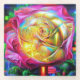 Una fascinante pintura digital de un rosa reventando con energía psicodélica y tonos arcoiris. Los pétalos rosados vivos se envuelven alrededor de un núcleo dorado brillante, creando una pieza central floral surrealista.