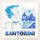 Santorini Grecia, gran escape para el verano La imagen representa una representación estilizada de Santorini, una isla griega conocida por sus impresionantes pueblos blancos y sus impresionantes puestas de sol. La imagen muestra un contorno azul de la isla de Grecia, con un énfasis destacado en Santorini. Se presenta una imagen estilizada de una iglesia tradicional de Santorini con una cruz sobre su cúpula, así como una representación de la icónica arquitectura azul y blanca. La palabra "SANTORINI" aparece en negritas letras negras, parcialmente oscurecidas por olas azules y blancas, que simbolizan el mar Egeo que rodea la isla. La imagen general es una representación simplificada y gráfica que evoca la belleza y el encanto de la isla.