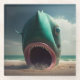 Shark sculpture on the beach, in the style of rendered in cinema4d, surrealistic grotesque, dreamlike illustration, dark cyan and green, concept art, gigantic scale, fish-eye lens