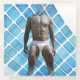 SlipperyJoe hombre muscular seis paquetes abs malla ropa interior blanca malla azul mosaicos en forma de diamante moderno fondo de superficie digital abstracción artística orgullo gay regalos LGBTQIA carne y píxeles colisionan irreal fusión de sueños únicos diseño audaz