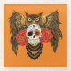 Un gran búho de cuernos marrones con un día de cráneo de azúcar muerto y rosas rojas en un telón de fondo de naranja.