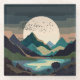 Un paisaje abstracto de una superluna masiva en una escena de un lago montañoso con una bandada de aves en texturas atrevidas y tonos oscuros de tierra de marrón, beige, marrón, azul, cian y negro.
