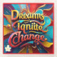 Un diseño vibrante con el texto "Los sueños incitan al cambio" en una deslumbrante gama de colores, acentuado con toques dorados que brillan como estrellas. La tipografía audaz está rodeada de formas abstractas y patrones giratorios que simbolizan la energía y el potencial de la creatividad. Este artículo inspira a los espectadores a aceptar sus aspiraciones y transformarlas en realidad."Imagen original generada por Meta AI. La IA generó obras de arte. Con licencia CC BY-SA 4.0.