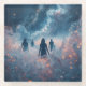 Four shadowed figures walk through glowing mist, surrounded by swirling stars and cosmic light.