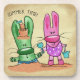 Un lindo conejito rosa y caprichoso ha enterrado al pequeño conejito verde hasta su barbilla mientras juegan en la arena. Diseño original de Christie Black de Creations from the Heart.