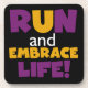 Si te gusta correr, correr 5 Ks, 10 Ks, media maratón, o maratones, te encantará este colorido diseño de texto en morado y amarillo que dice Correr y abrazar la vida! Corre y abraza camisetas de la vida, caramelos, imanes, botones, tarjetas, pegatinas, llaveros y muchos otros artículos para corredores que aman un diseño de ejecución brillante y colorido.