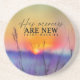 La montaña rusa de Sandstone representa una hermosa pintura acuática con un naranja sencillo y un amanecer amarillo sobre un campo azul niebla. Presenta una cita inspiradora, "Sus misericordias son nuevas cada mañana".