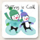 Dos pingüinos patinan sobre el estanque congelado vestido con rayas, coloridos gorras de invierno, bufandas y mitones y texto negro dice Patinaje sobre temas de patinaje: camisetas, tazas, tarjetas, bolsas, bolsos, almohadas, patines, pegatinas y mucho más!