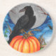 Pintura original de Sandra Gale para la temporada de Halloween con un cuervo negro encaramado en una calabaza. Gran diseño para niños y adultos para celebrar la espeluznante fiesta de Halloween.