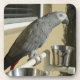 Un loro gris africano del Congo disfrutando del sol en su atril de pájaros portátil.