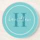 Elegante diseño de montaña de bebidas redondeadas personalizadas con un clásico monograma de serif personalizado inicial en un color azul verde verde azulado con tu apellido en un guión moderno de caligrafía blanca contra un fondo de color azul acuático. Un simple círculo blanco enmarca el diseño. El esquema de color se puede personalizar para que se coordine perfectamente con la decoración de tu hogar.