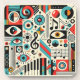 Diseño abstracto colorido con motivos geométricos y musicales, incluyendo ojos, gráficos de partituras y formas, que ofrece una vibrante mezcla de arte y creatividad.