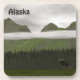 Una pintura digital "primitiva" o folclórica de árboles de coníferas verdes y montañas en Alaska en un día muy gris y nublado. Un alce de toro (Alces alces) en primer plano da escala a la escena. También aparece el texto de personalizable "Alaska".