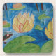 Si eres amante de las acuarelas originales y coloridas, te encantará esta atractiva pintura de ranas y lirios. Esta escena lacustre de verano está pintada de amarillo, melocotón, azul, verde y marrón.