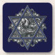 Elegante Estrella de David con tradicional símbolo hexagrama azul y blanco complementado con un adorno barroco de fondo plateado. Arte de Margaret Loftin Whiting.
