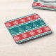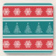 Feliz ilustracion navideño con árbol de Navidad y decoración de copos de nieve sobre fondo rayado rojo, blanco, azul y turquesa