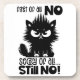 A funny, sarcastic black-and-white graphic design showcases a black cat with frazzled fur and a scowling expression. The black handwritten text says, "First of all, no. Second of all, still no!" Available on a wide variety of products, this design makes a perfect gift for cat lovers.