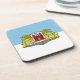 Coasters with design with flag of Riga, capital city of Latvia; white and blue flag with coats of arms with two golden lions holding a shield in the center