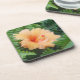 La flor anaranjada del hibisco que vemos en esta fotografía original está mirando a escondidas hacia fuera entre de algunas frondas verdes del helecho en un jardín precioso. La flor está en la plena floración, con sus bordes rizados colocándose hacia fuera del fondo de helechos. La forma de la flor es como una trompeta, curvando hacia fuera, con los troncos amarillos rematados con los puntos rojos en el centro de la floración. La foto es un primer que muestra el detalle en los pétalos de la flor de esta belleza coloreada melocotón.