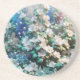 Un bullicioso conjunto de flores blancas se alza en medio de un marco de ensueño de vegetación suavemente colorida, con toques de azul y rosa. Las orbes perlas flotan alrededor de la flora, añadiendo un toque de capricho a la escena.